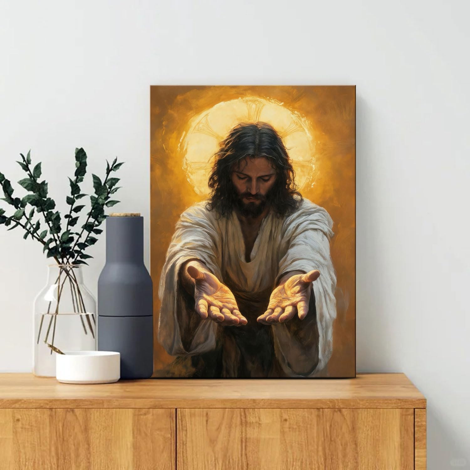 - Spiritual Christian Wall Art This 24x36 inch framed canvas print features a powerful image of Jesus Christ reaching out with open hands, set against a radiant golden halo, bringing a sense of peace and divine presence to any room.