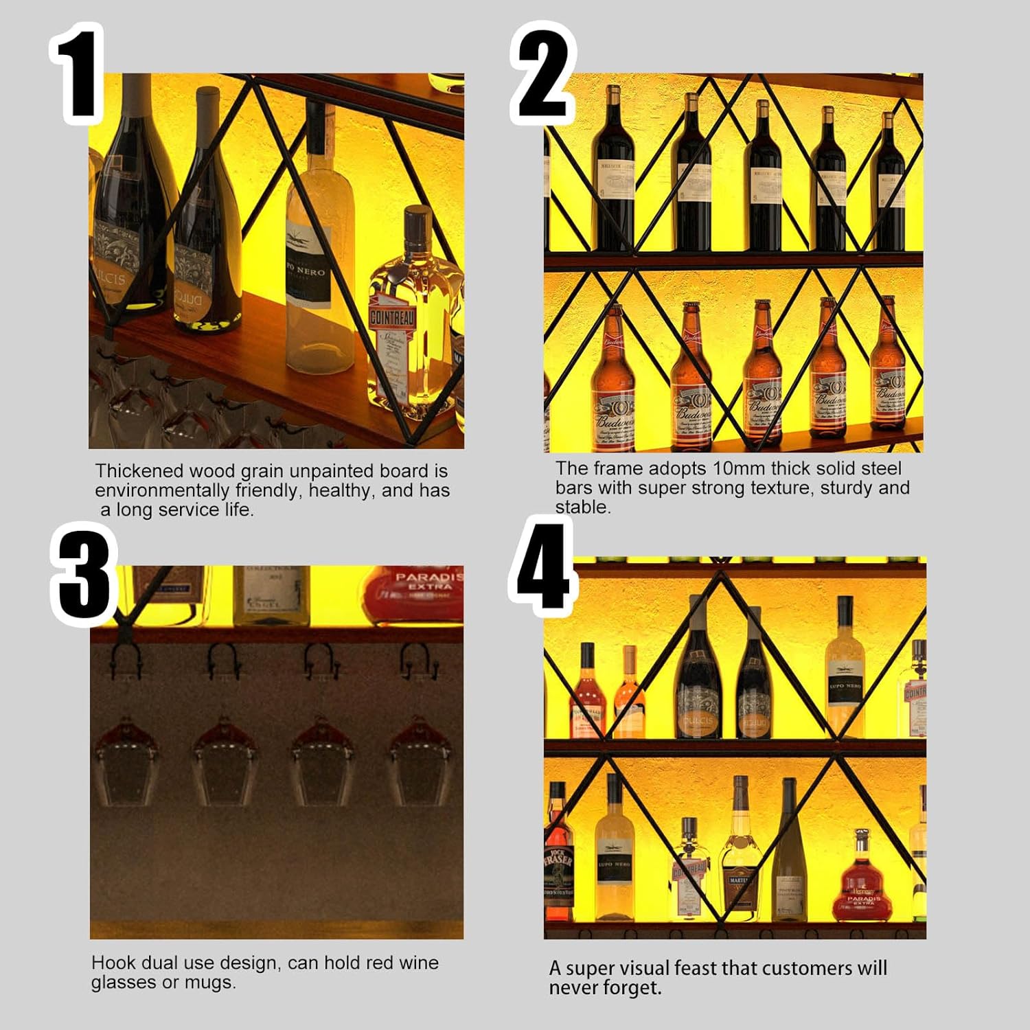 - Multi-function: Well-designed wine glass rack for wine glasses and free placement of wine. This wall-mounted wine rack can not only store wine bottles, but also other items to make your space more sophisticated.