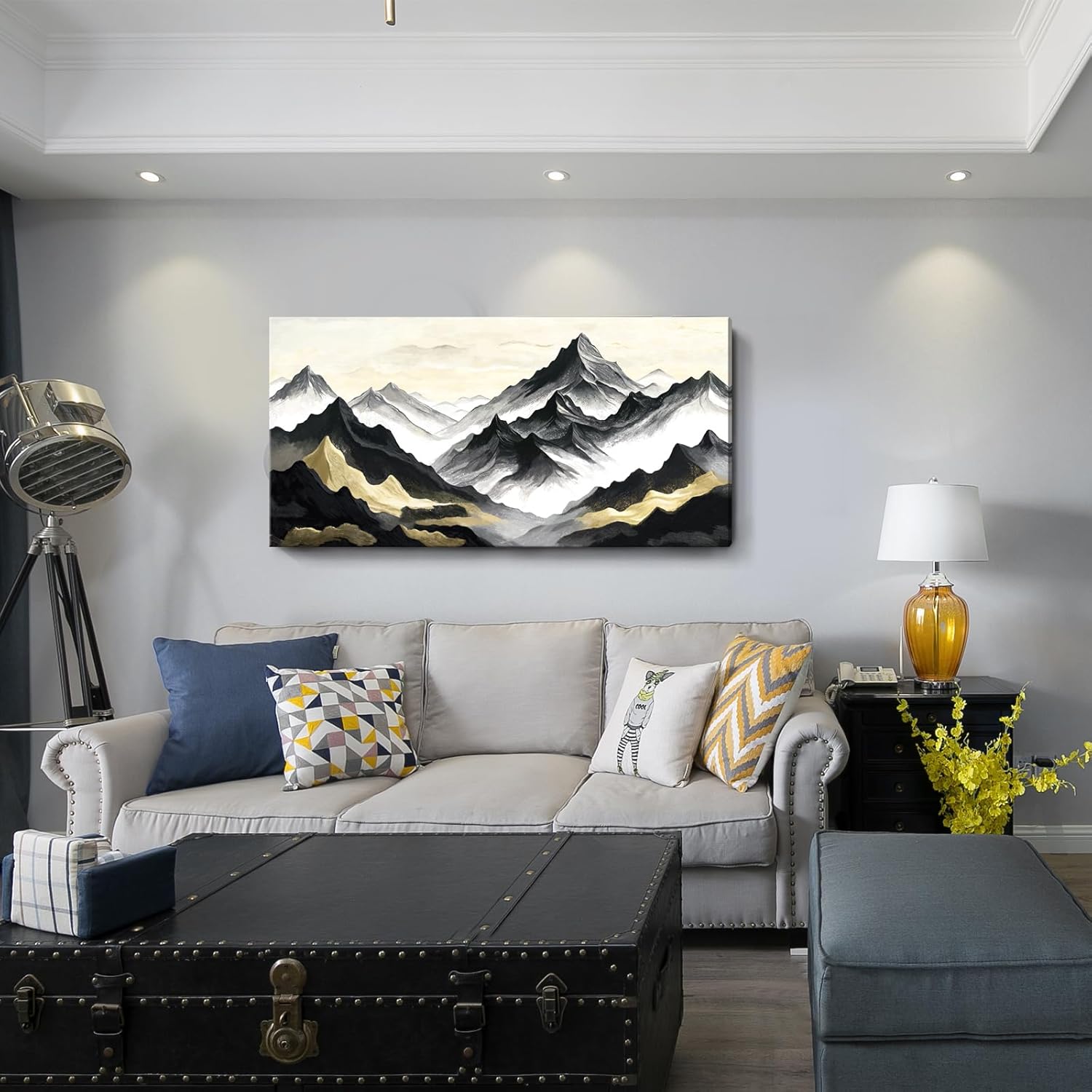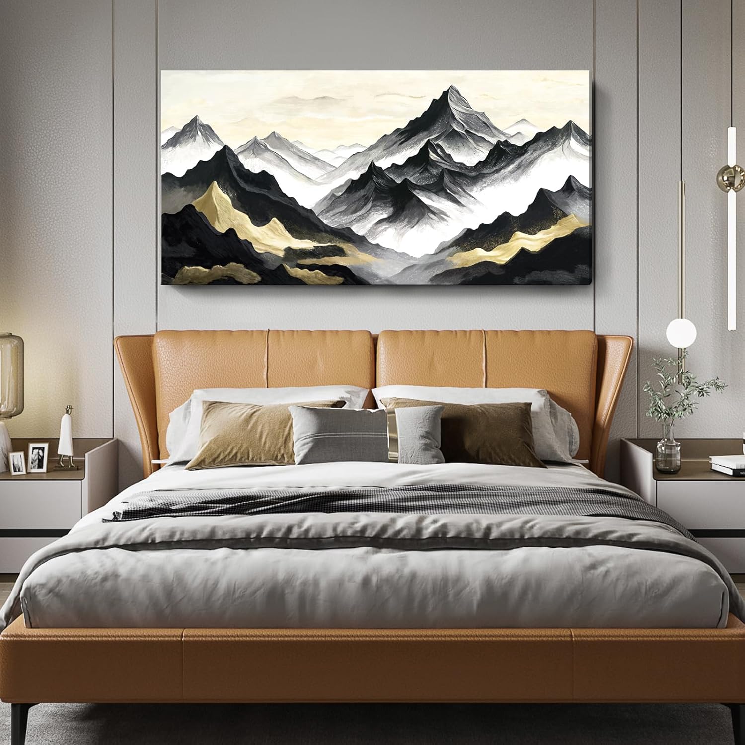 - “Rise Above” – Inspirational Wall Art: A striking black, white, and gold canvas art print featuring abstract mountains, valleys, and layered hill scenery. This modern landscape large wall art evokes growth, resilience, and clarity, adding a powerful visual statement to your living room, office, bedroom, or meditation space.