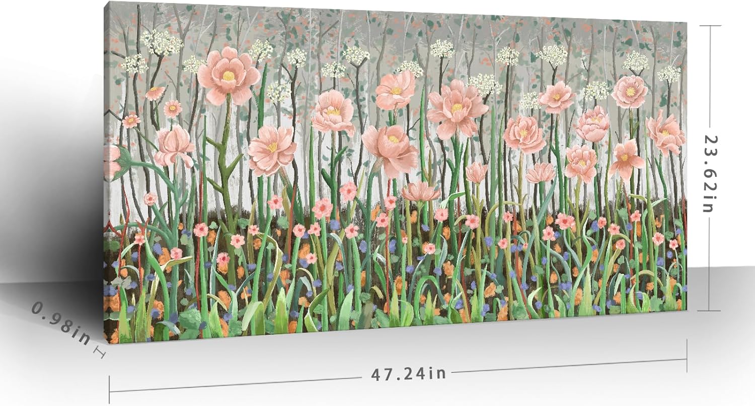 amatop Large Floral Wall Art Modern Abstract Flower Field Canvas Picture Botanical Artwork Rustic Wall Decor for Living Room Bedroom Pink Green Blooming Wildflower Forest Nature Art Print 48x24in