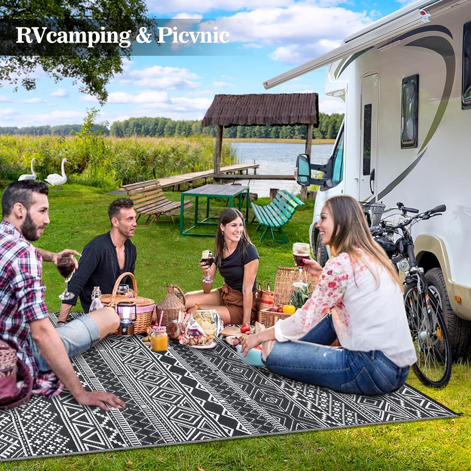 GAOMON Outdoor Rug for Patio 5'x8' Reversible Plastic Rugs Camping Mat for Outdoor, RV, Backyard, Deck, Balcony, Picnic, Beach, Black/White(Bohemia)