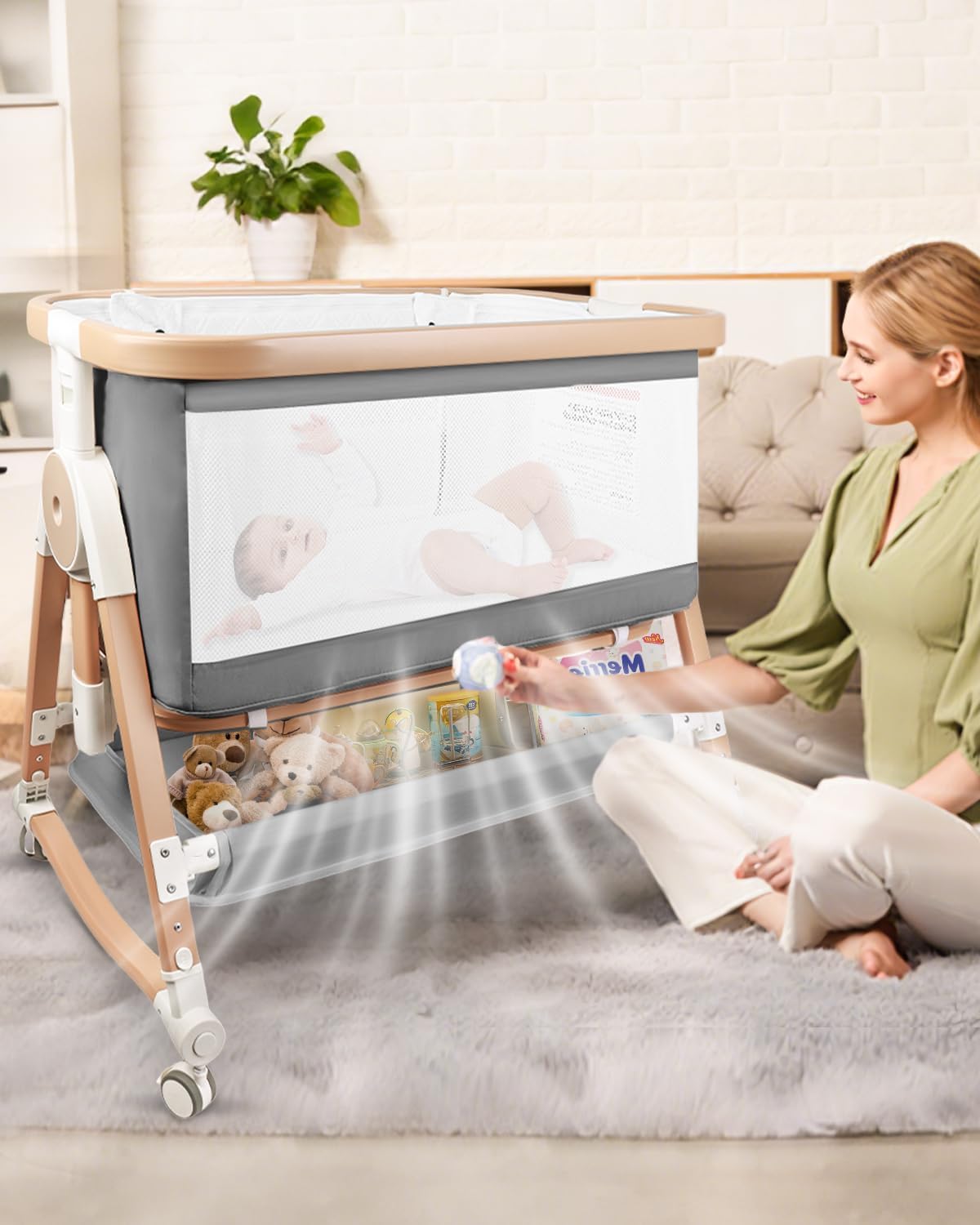 - Large Storage Space: The bottom of the bedside bassinet for baby is equipped with large, sturdy storage space for baby's toys, clothes, diapers and other baby essentials, making it easy for parents to quickly access them when needed