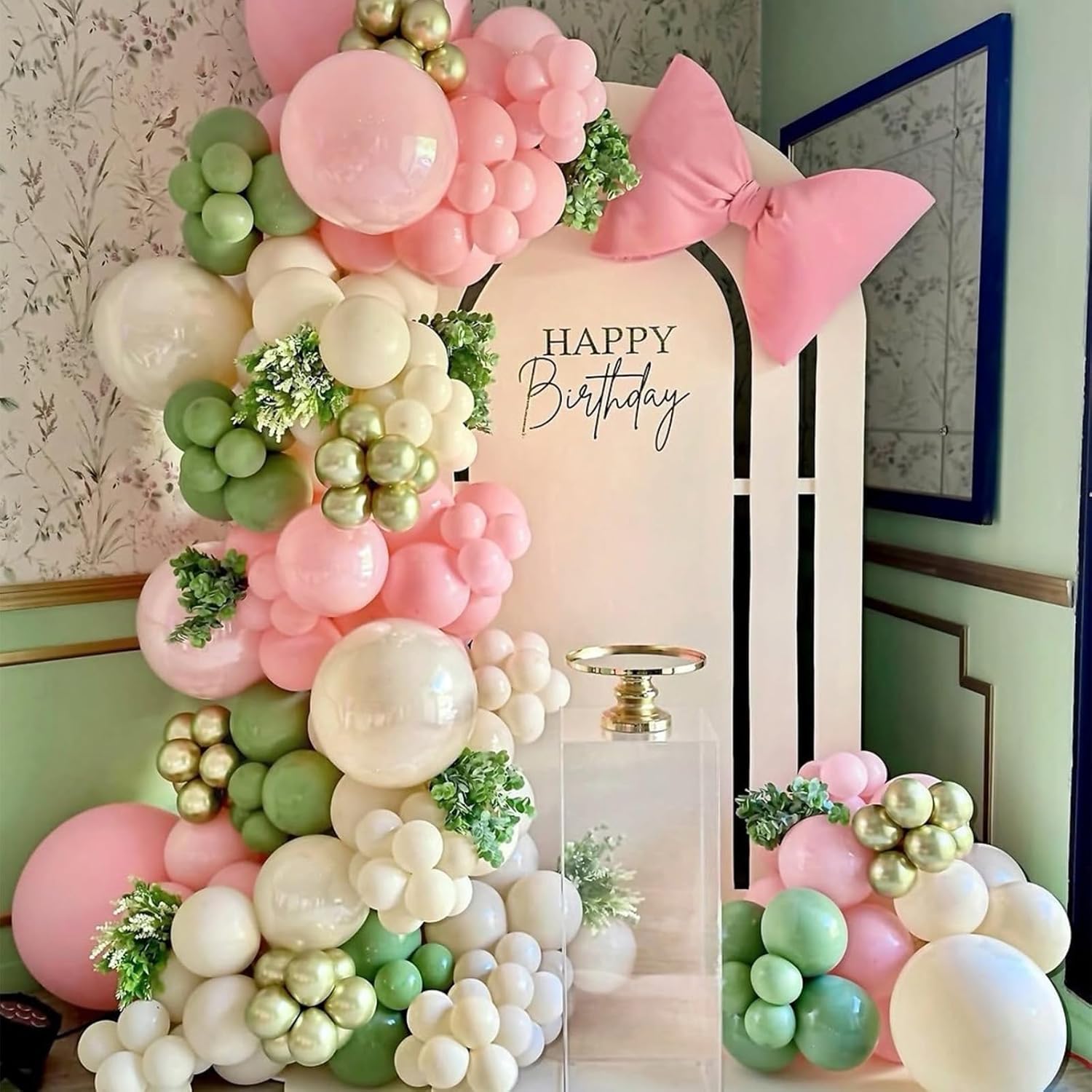 - Pink and Green Balloon: Includes 12 inch 55 pcs helium balloons with 15 pcs pastel pink balloons, 15 pcs sage latex balloon, 15 pcs cream balloons, 10 pcs gold balloon and a roll white ribbon