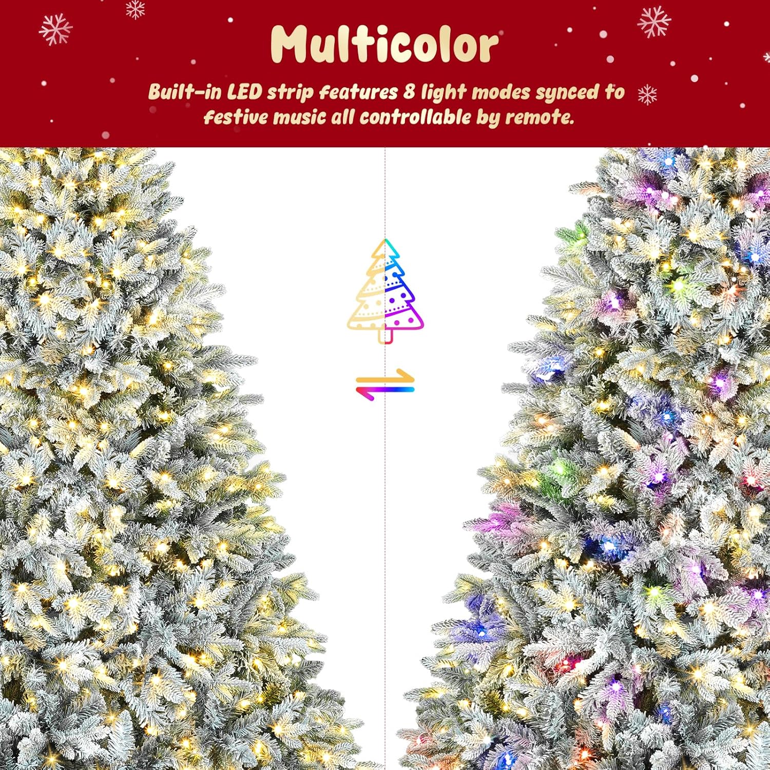 - Rotating Flocked Christmas Tree–Full 360° Display: Experience the magic of a rotating pre-lit Christmas tree with flocked snowy branches. The built-in rotating base turns slowly to highlight every side of your ornaments and décor.