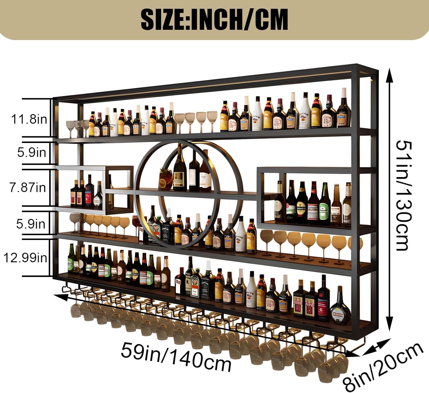 - ăLarge Storage SpaceăThe wall-mounted wine rack can be used as a bar decoration or a large wine storage cabinet. This height can store most wines or spirits when we sit at a small bar to relax all day or have a party. The wine glass rack is sturdy enough to hold more wine glasses. The wine rack doubles as a large storage rack, making the space look neat and organized