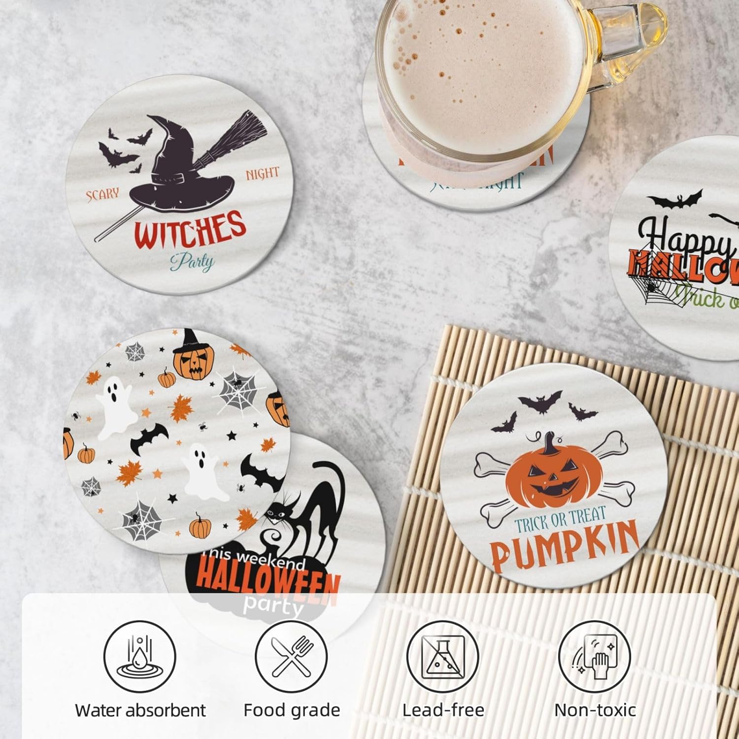 6 PCS Halloween Coasters with Metal Holder and Cork Base Ceramic Drink Coasters Absorbent Cup Mat Non-Slip for Home Kitchen Office Table Decor, 4 Inch Halloween 1