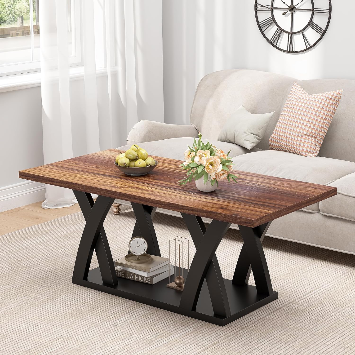 - 【Stylish and Functional Coffee Table】 This coffee table features a rectangular design with a modern touch, making it perfect for wood coffee tables for living room or as a mesa de centro para sala. Its coordinated colors and sleek X-shaped base blend effortlessly into various styles, whether as a Farmhouse Coffee Table with Shelf or a centerpiece in a traditional setting. The black blown coffee table design adds a timeless elegance to any space.