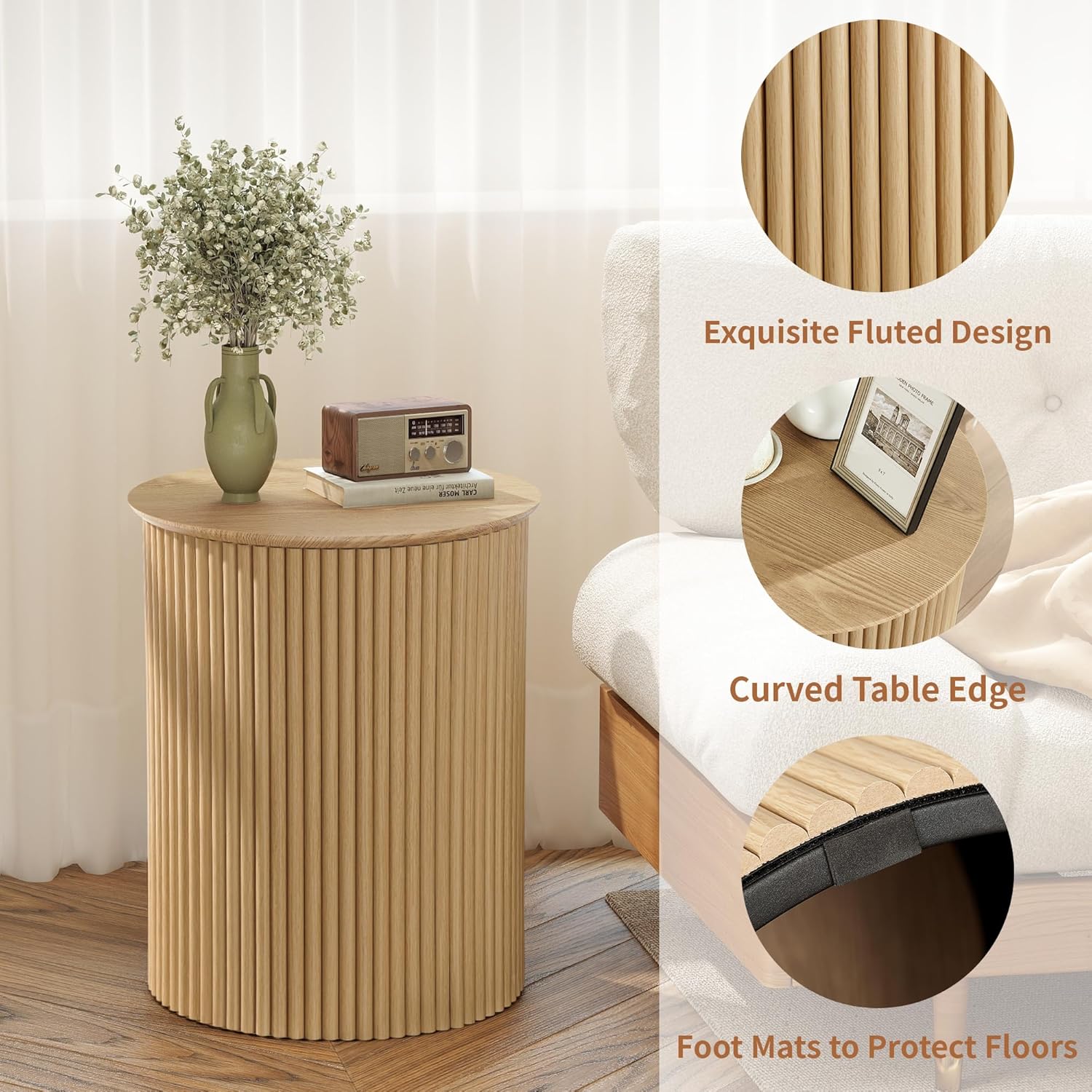 AVZEAR Fluted Round Side Table, Small End Table Modern Boho Nightstands, Circle Bedside Tables Bohemian Accent Table Wood Night Stand for Small Spaces, Living Room, Bedroom(Natural)