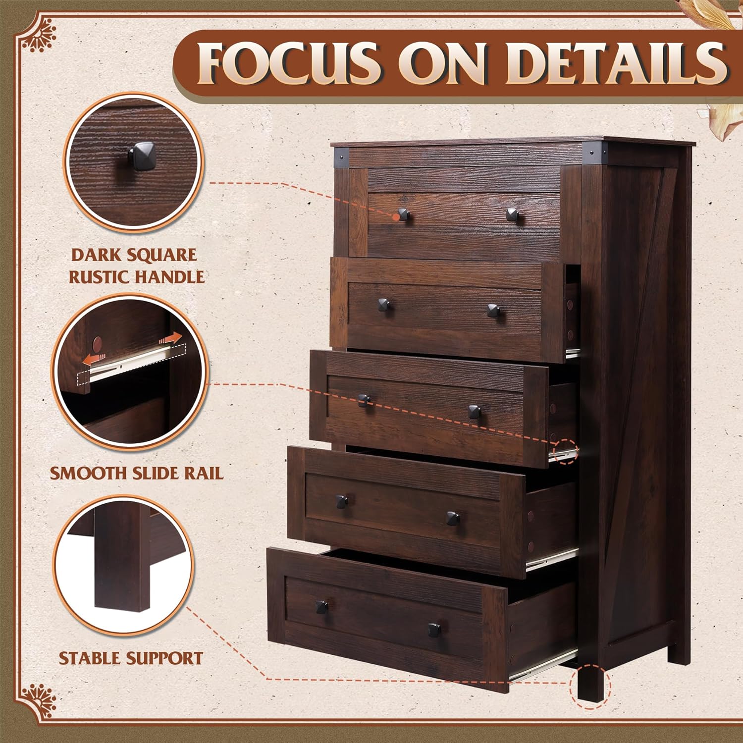 - 🎄【Farmhouse 5 Drawers Dresser】This wooden dresser farmhouse look is heightened by the rustic color finish coupled with the side barn sign and the dark square handle adds a rustic charm. It can be used for bedroom clothing organizer, entryway table, decorative storage for living room.