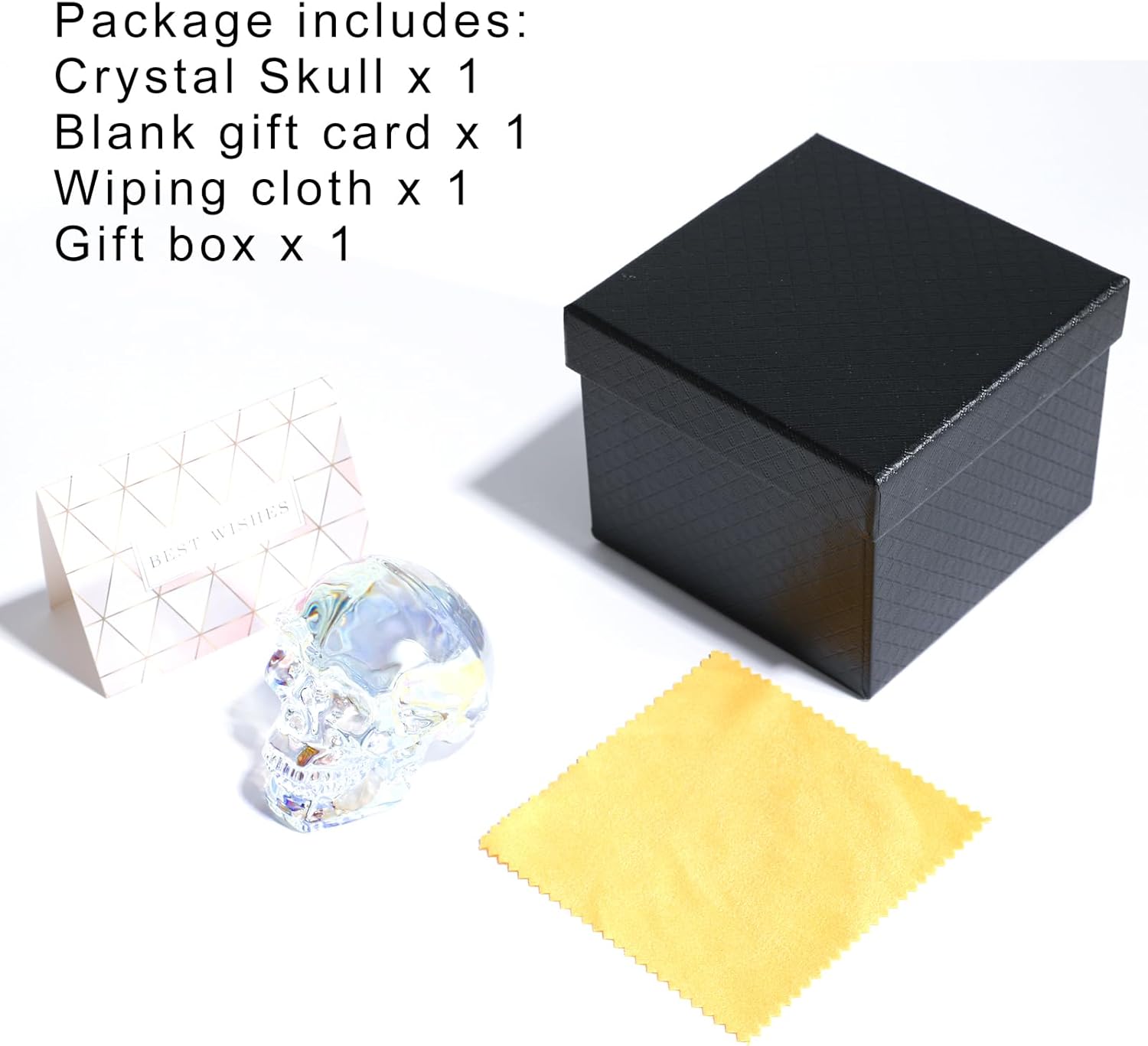 - Gift Box Packaging: All our crystal skull ornaments come beautifully packaged in an exquisite gift box, which includes a cleaning cloth and a wish card (a blank card for you to write your blessings). They are ready at any time to bring her surprises and love.