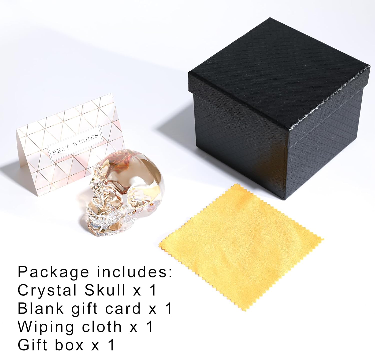 - Gift Box Packaging: All our crystal skull ornaments come beautifully packaged in an exquisite gift box, which includes a cleaning cloth and a wish card (a blank card for you to write your blessings). They are ready at any time to bring her surprises and love.