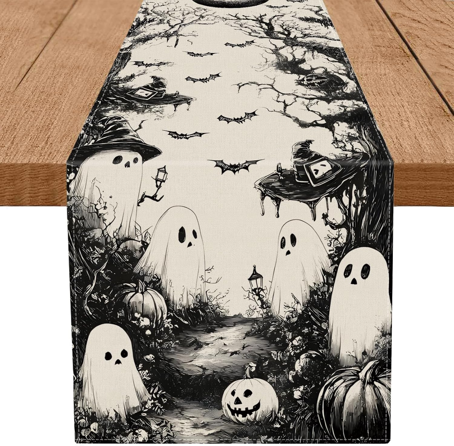 GPGHE Halloween Table Runner Black Ghost Holiday Burlap Table Decoration Indoor Outdoor Home Decor Party Supply 13 x 120 Inch
