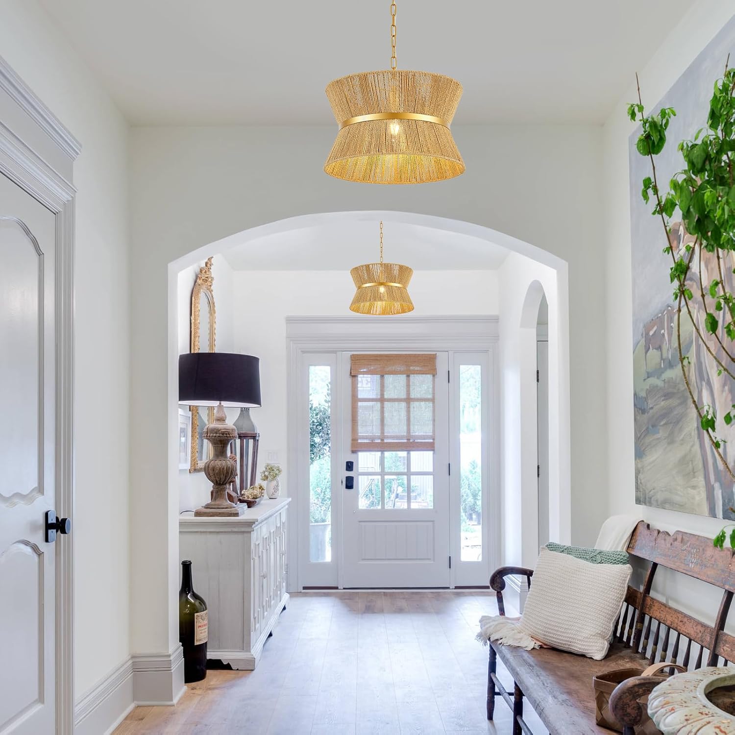 • Hand Woven Rattan: This boho pendant light features a rattan weaving technique that wraps around the entire light, complemented by brass-toned rings at the connecting points, giving the lamp a vibrant and sophisticated appeal.