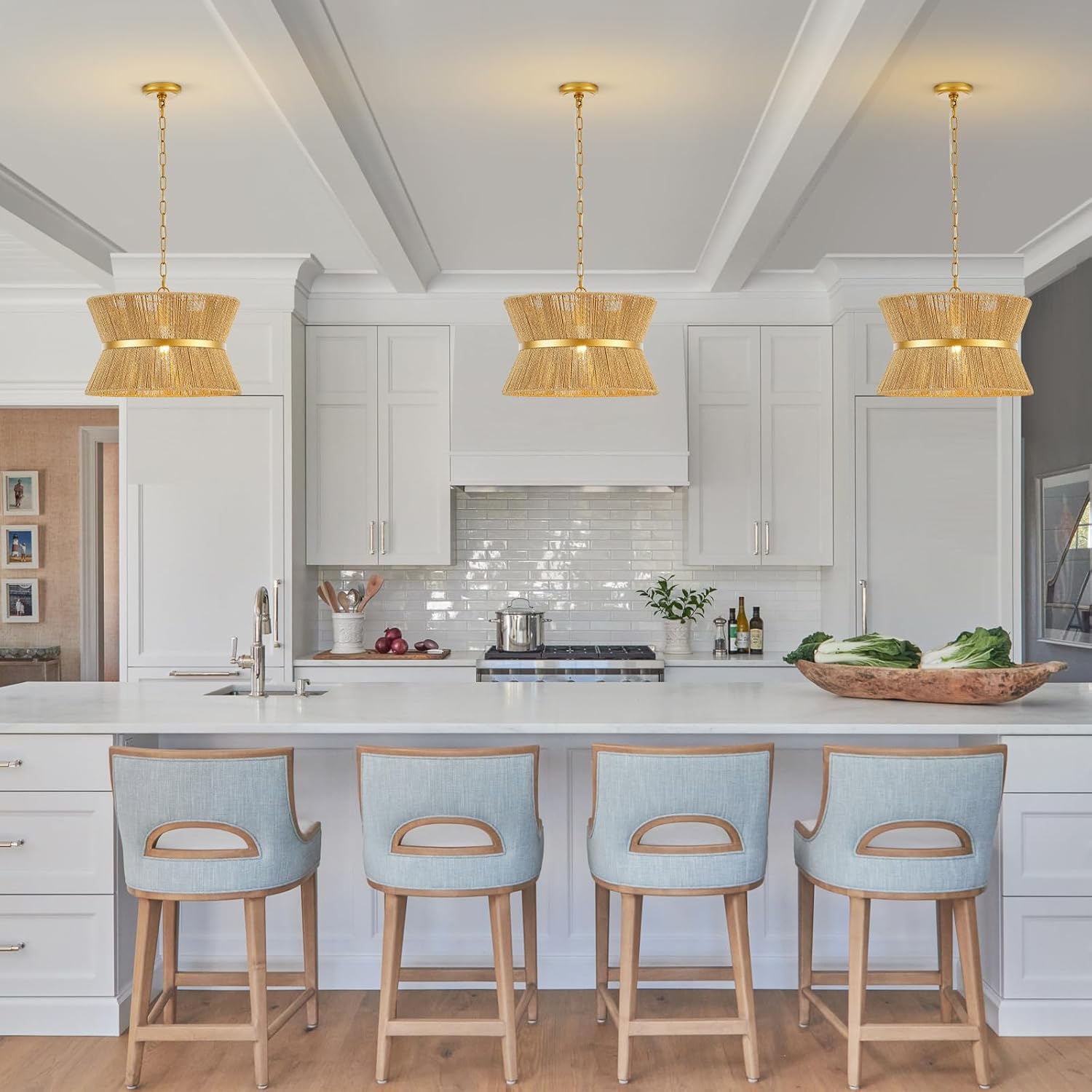 18” Hand Woven Rattan Boho Chandelier Brass Ajustable Pendant Light for Kitchen Island Living Room Bedroom Hallway, UL Listed